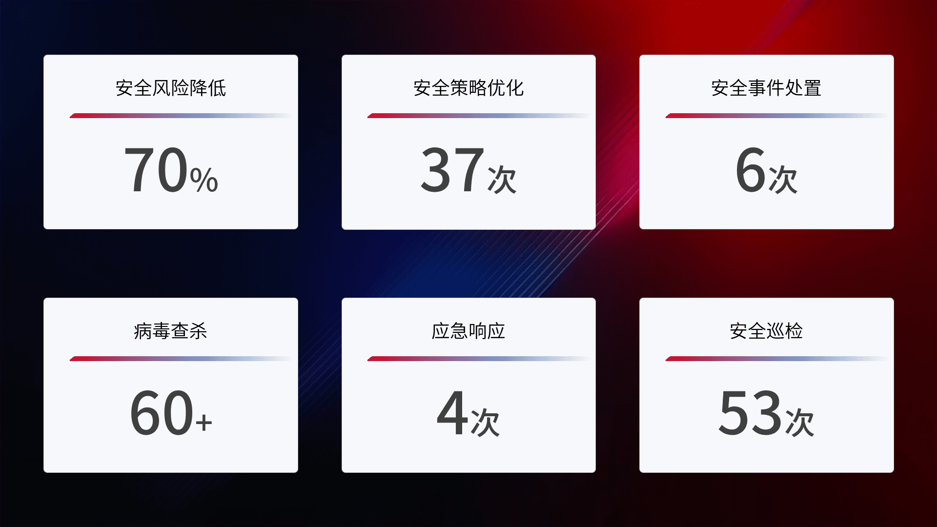 提供全面的安全事件报告体系,,包括处置报告、、、周报、、、季度和年度总结,,,,结合持续监控,,,帮助客户深入了解网络安全状况。。